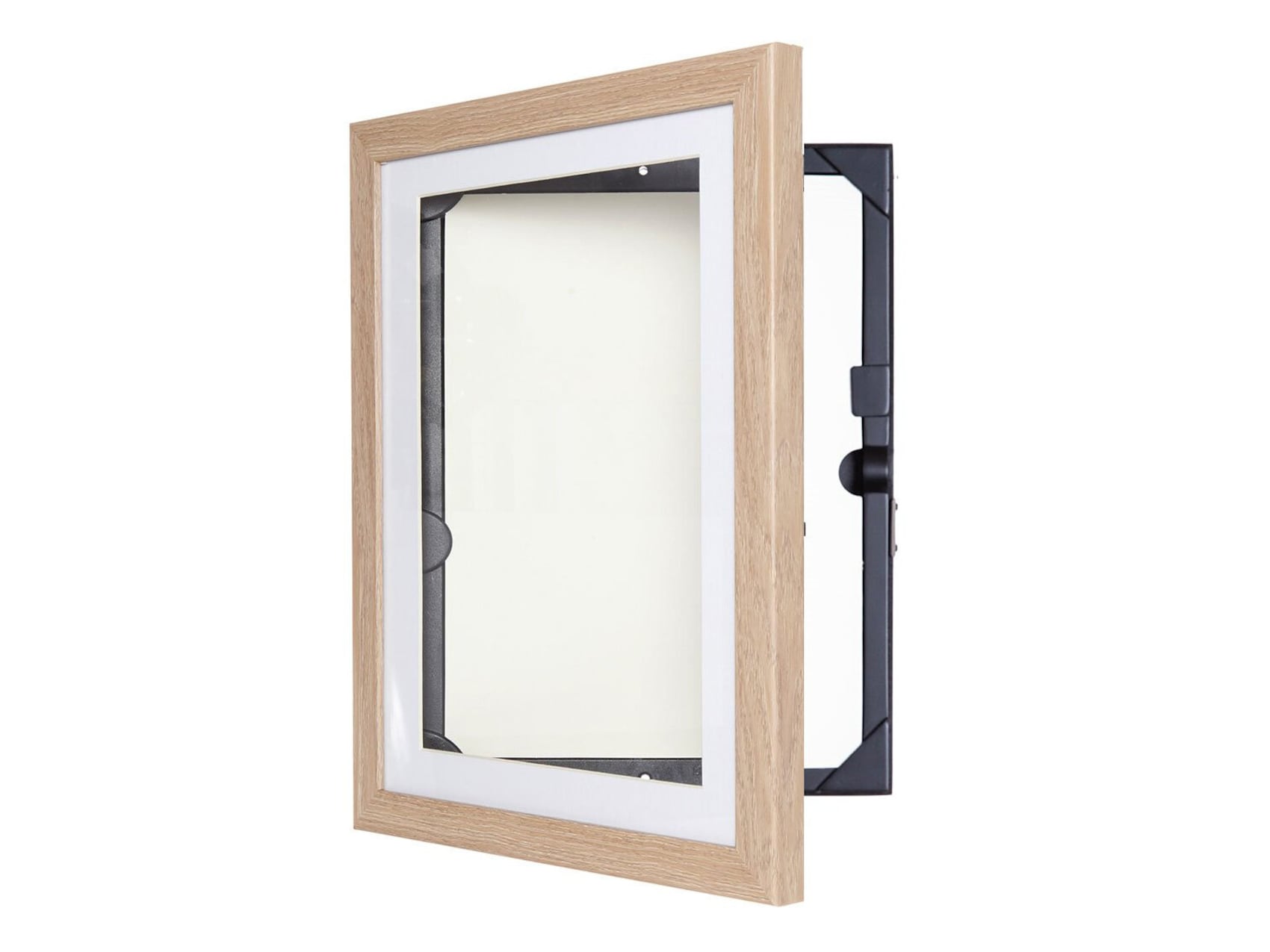 ‘Smart’ Rammen fås i en størrelse – A4 – men i fire forskellige materialer/farver: Eg, sæbebehandlet eg, brunmalet eg og sortmalet egetræ. Det er en frontloaded ramme, hvilket betyder at tegninger og plakater skubbes ind fra fronten af.