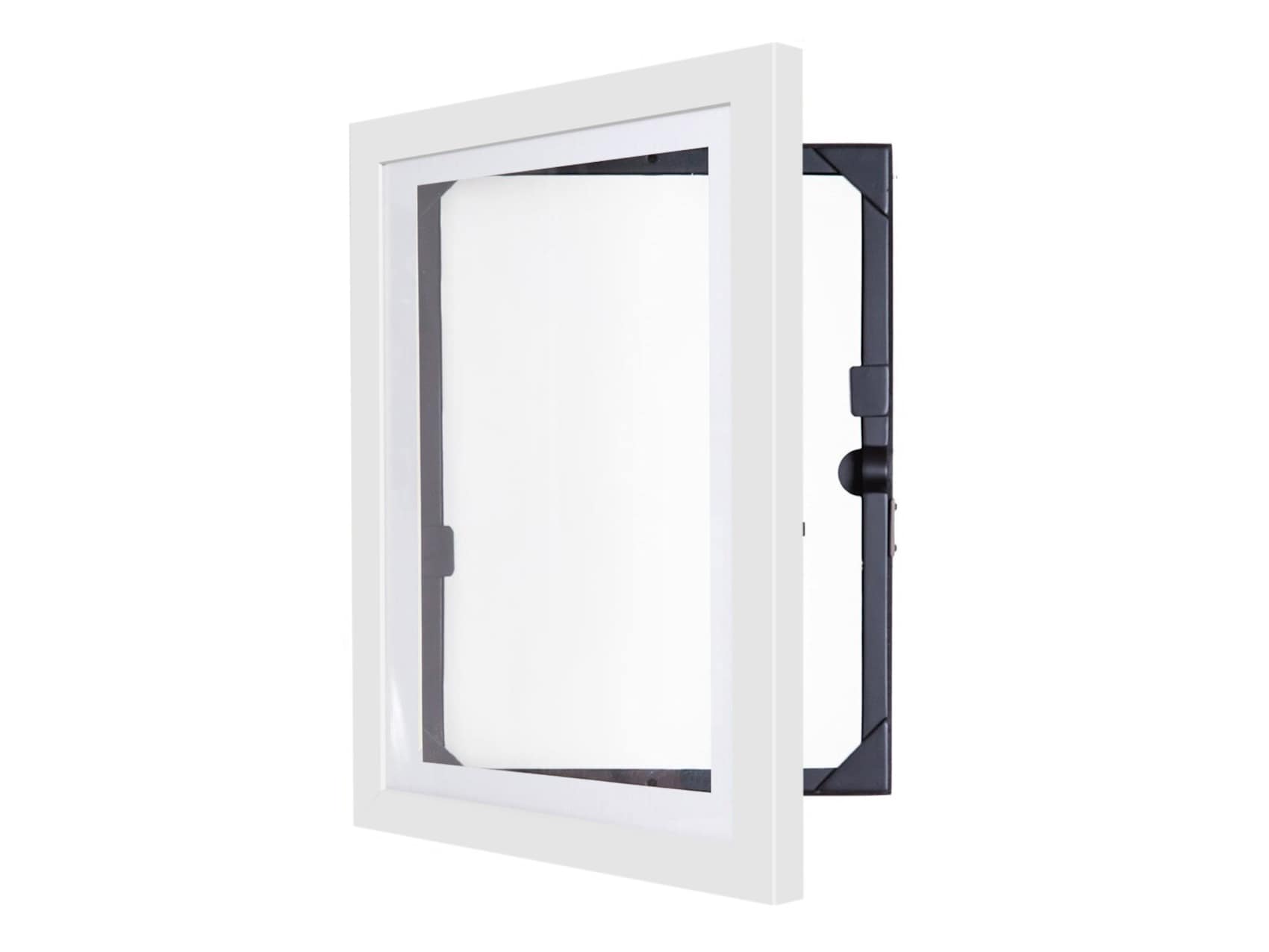 Rammen fra My Little DaVinci fungerer på den måde at man åbner rammen forfra som en låge, og behøver derfor ikke tage den ned fra væggen. Herfra skubber man så tegningen på plads og bagpladen der holdes på plads af nogle fjedre sætter den i spænd, hvorefter du så kan lukke rammen igen og nyde den nye udstilling på din væg. Denne push ramme til børnetegninger fås i 3 forskellige farver: sort, hvid og træ.